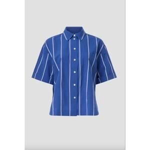 Blue striped (100% Cotton). Top. Short sleeves. Collared neckline. Front button closure. 26.5" from shoulder to hemline. Imported.