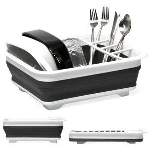 Streamline your kitchen with this foldable black and white dish drying rack. Ideal for drying dishes and utensils, it offers a modern touch to your kitchen space.