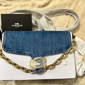 Chic Coach crossbody bag in denim. Features a stylish gold chain detail. Ideal for casual elegance.