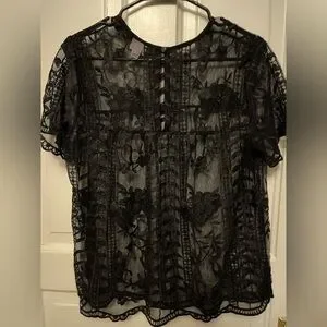 Chic black lace blouse with floral patterns. Short sleeves and sheer design. Perfect for layering. Never worn.