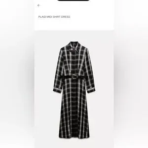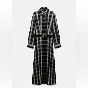 Worn once. In great condition. checkered dress with long sleeves. Features a stylish belt for a tailored look. Ideal for versatile wear.