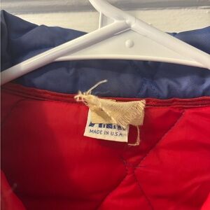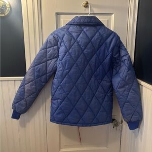 The Vintage Jacques Seeds Blue Quilted Swingster Bomber Jacket Chore Coat is a stylish and unique piece with a nod to 80s fashion. Made of nylon with a solid blue color and quilted accents, this mid-length jacket is perfect for casual or workwear occasions. The regular fit and wing collar add a touch of retro charm, while the bomber style makes it a versatile option for winter, fall, or spring seasons. Made in the United States, this vintage jacket from Swingster is a cool addition to any man's wardrobe. Coat has no holes tears or losses. Heavy fading on front and back in body and on sleeves as shown in picture.