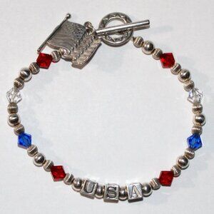 Sterling silver handmade bracelet in a USA Fourth of July motif. Bracelet is made with sterling silver components, crystal beads, flag charm and ending with a toggle clasp.
