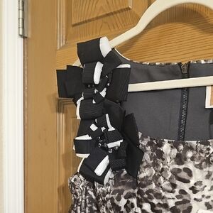 Stylish one shoulder dress with bold animal print. Features black and brown tones. Perfect for a night out.
