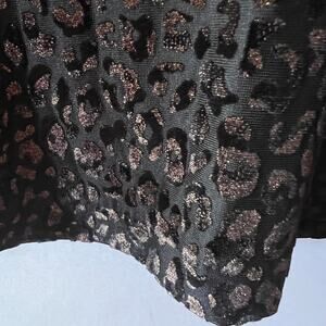 The unique bronze/gold leopard print shimmers subtly against the black sheer fabric, creating a look that's both sophisticated and eye-catching. The body is fully lined for comfort and coverage, while the zippered sleeves add a touch of edgy flair. The cross-over ruched front flatters your figure, and the back zipper with eye hook closure ensures a secure and seamless fit.