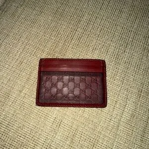 Gucci card holder in rich burgundy. Acceptable used condition - still fully functional, just dirty/stained. May be able to remove stains or dye card holder black. Will not accept returns as this is being sold in as-is condition.