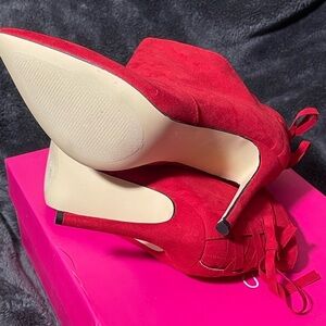 ShoeDazzle Nathaly Red High Heel Boots, Red Ribbon Lace Up Booties, Pointed Toe