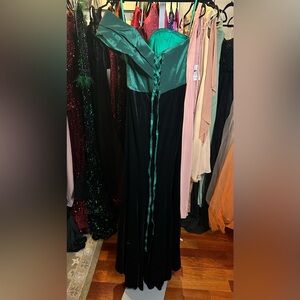 This elegant off-shoulder dress features a stunning green bodice and a sleek black velvet skirt. Perfect for evening events and special occasions.