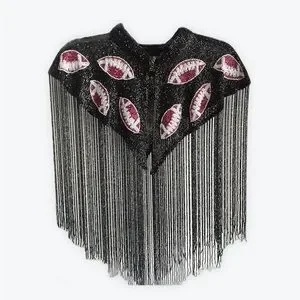 Elegant black cape with shimmering black fringe and bold red accents. Ideal for making a statement.