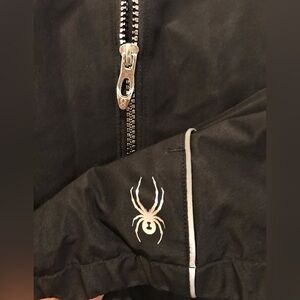 Spyder Black Full Zip High Neck Windbreaker Hooded Jacket Size (Medium). Stay stylish and comfortable with the Spyder Black Hooded Jacket, perfect for cold windy fall and winter days. Silver tone full zipper hardware. This jacket offers both functionality and fashion with side reflective vertical strips on sides and reflective SPYDER logos.