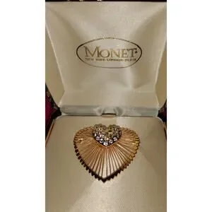 The brooch features brilliant clear rhinestones set in a raised heart, framed by a textured gold-tone fan-shaped heart. Classic, elegant, and very representative of Monet’s high-quality 1980s–1990s statement jewelry.