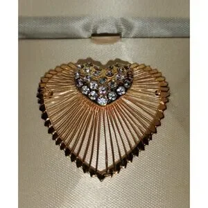 Vintage Monet Rhinestone Heart Brooch w/ Box – Gold Tone Radiant Fan Design