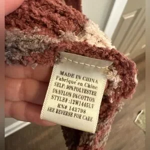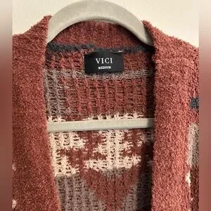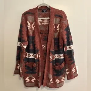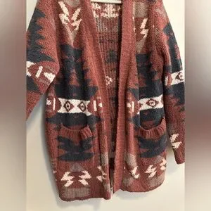 Cozy cardigan with bold patterns. Features rust and black colors. Perfect for layering.