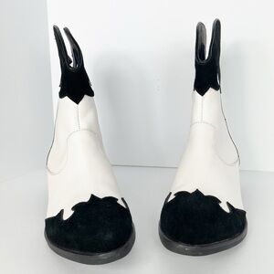 Stylish ankle booties with a bold black and white design. Perfect for a standout look. Hinged Cushion Insole. Pull On. Gently Used.