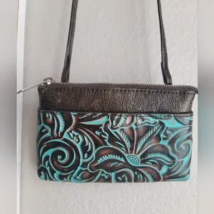 Patricia Nash Teal and Brown Tooled Leather Bacoli Crossbody