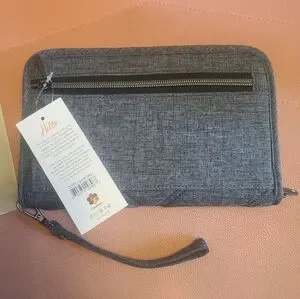 Chic charcoal wristlet, Zeppelin by Lug. Features quilted design and wrist strap. Tons of room for cards, passport, ID, all you need to carry with you. Perfect for everyday use or for traveling.