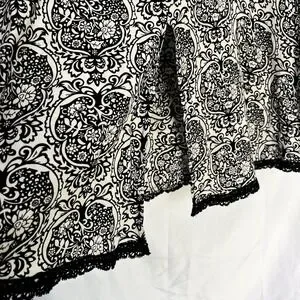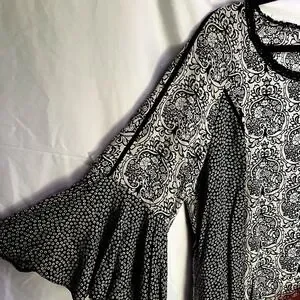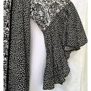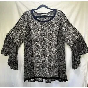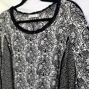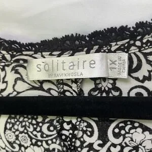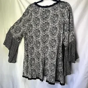 Solitaire by Ravi Khosla Top, Womens size 1X, Black & White Mixed Prints, Crochet Trim, Flattering for a Curvy Shape. This flirty tops has flowy bell sleeves, slimming accenting style lines, crocheted trim, and a 11" slit at the center back. Very good preowned condition, no stains or flaws. Chest 48", sleeve 17", length down the center back 30".