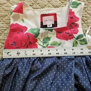 Calico Closet, 4t Charming dress featuring an upcycled vintage linen floral bodice and polka dot skirt. Includes a stylish red and black pocket. Easy fit, pullover.
