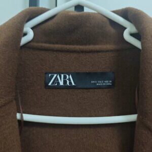 Brown, with a tie but no buttons, shoulder width 43cm, waist 58cm, length 105cm, shows signs of wear.