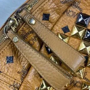 Stylish MCM backpack with gold and black studs. Iconic logo pattern. Ideal for fashion-forward looks.