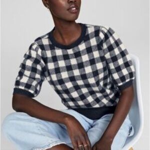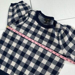 Charter Club Luxury Checkered Cashmere Short Puff Sleeve Sweater Navy White S