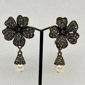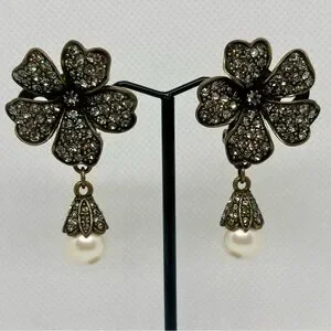 Vintage Rhinestone Pearl Drop Clover Clip-On Earrings 🌸 Lucky Charm Statement Jewelry
