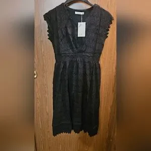 Elegant black midi dress featuring intricate lace detailing. Perfect for any formal occasion.
