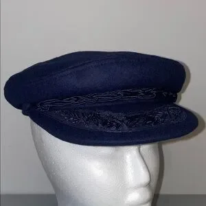 Authentic Greek Fisherman’s Cap. Wool 85% , 15% Nylon in navy blue cap with decorative band. I believe the size is 56-7? Made in Greece.
