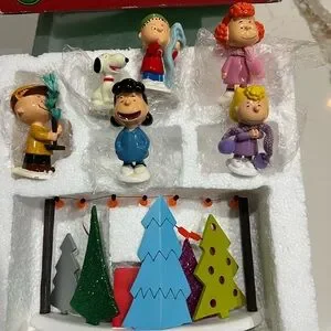 Vintage Department 56 “Peanuts Tree Lot” set with six vibrant Peanuts characters. Includes colorful trees and signs. Original box. Ideal for holiday decor and Peanuts enthusiasts.