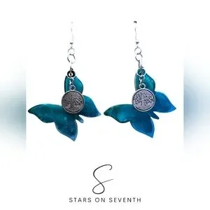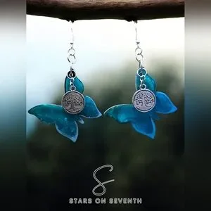 Embrace the beauty of growth and change with these symbolic earrings. Deep, swirling teal butterflies serve as the backdrop for sacred Tree of Life charms, beautifully combining two powerful symbols. Wear them as a reminder of personal transformation and your deep connection to the earth.