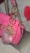 HANDBAG: Gorgeous quilted hearts throughout, rhinestone encrusted logo hardware on front flap. Inner zip pocket a.d slip pocket. Fixed shoulder strap with chainlink detail. So pretty! Approximately 10w x 6h x 2.5 deep, 7in drop.