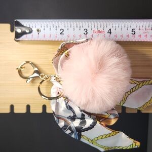 Chic keychain or purse charm featuring a pink and white silky bow with a fluffy pink pom pom. Perfect accessory for bags or keys. New