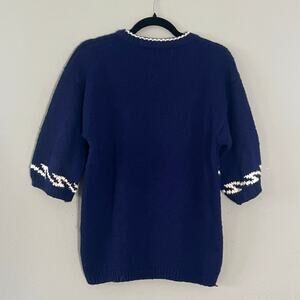 Vintage Sportables II women’s sweater featuring a charming sailboat pattern across the chest and sleeves. Classic nautical style with navy blue base, white and red accents, and half sleeves. 100% acrylic, made in Taiwan, circa 1980s. Approximate measurements: pit to pit 19 inches, length 25 inches. In good vintage condition with minimal signs of wear. Perfect for a coastal, preppy, or retro-inspired look.