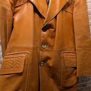 Stylish brown leather coat with button closure and front pockets. Perfect for a classic look.