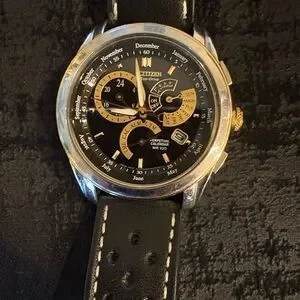 Stylish Citizen Perpetual Calendar watch with black and gold accents. Eco-Drive technology for reliable performance. Perfect for modern wear. Comes with black leather strap. No box. Some scratches from normal wear (see pictures).