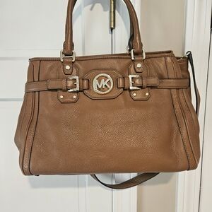 Chic and versatile Michael Kors satchel. Features rich tan leather and signature logo detail. Ideal for everyday use.