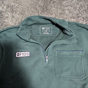Stay comfortable and stylish at work or home with the Figs Women's Green Quarter-Zip Sweater. Perfect for casual outings, this sweater offers a relaxed fit and a convenient chest pocket. Color is British racing green. Lightly worn but no noticable blemishes.