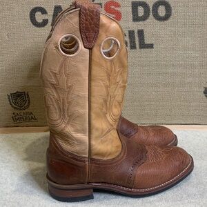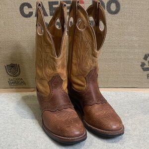 Hand sewn Stylish cowboy boots in brown and tan. Worn once, 1” heel with 12” tops. Leather with rubber Vibram soul.