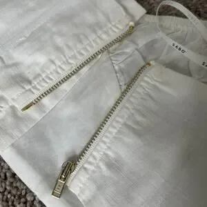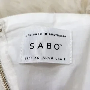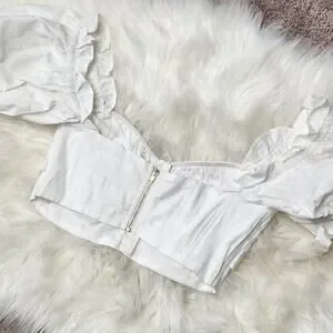 The perfect piece to pair with your denim or skirt! The Chantria Shirred Top is made from a linen blend fabric in an off white hue. It is a cropped style featuring short puff sleeves, shirred detailing across bust, covered buttons down centre front, boning at waist and ruffle detailing throughout. Zip up in the center of the back. It is fully lined excluding the sleeves. Designed exclusively by Sabo.