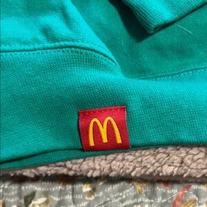 Bright green crewneck sweater with a bold face design. Features McDonald's branding. Perfect for casual wear.