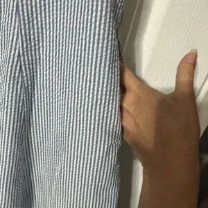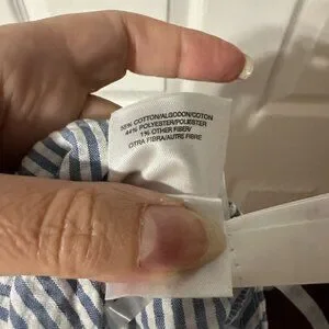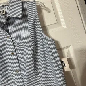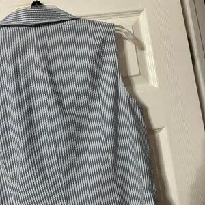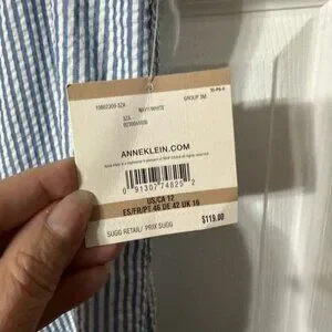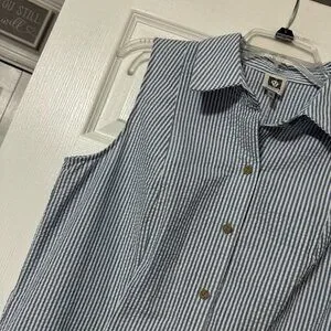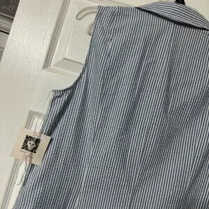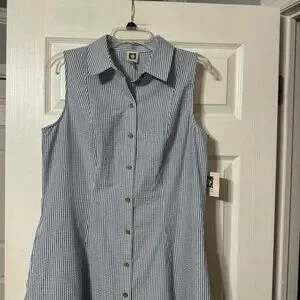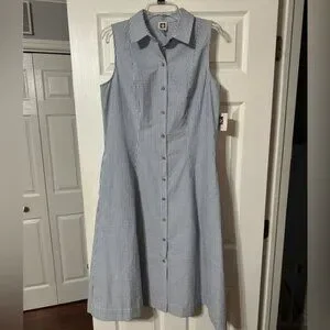 NWT Anne Klein seersucker sleeveless shirt dress. Navy and white striped pattern. Full length button down front closure. Fold down collar. Pockets at side hips. Cotton/Polyester/Other Fiber material. Size 12.