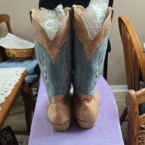 Stylish ankle boots with a unique tan and blue design. Perfect for any occasion.