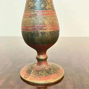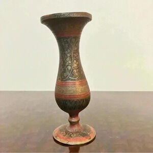We may never know, but we do know this is a very cool MCM vintage brass vase. Great patina and charm. The vase leans (as shown in the photo) and has a dent in the mouth. There is a made in India stamp on the bottom. About 6 in high