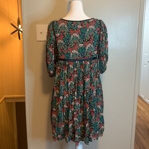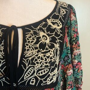 Anthropologie Floreat Ottava Peasant dress. Floral peasant dress with puff sleeves and tie at neck with tassel detail. Embroidered eyelet detailing on chest. Black, red, orange, green and blue color way. This dress screams Fall! Size small. EUC. No flaws noted. Length: 35", pit to pit 18.5" when laid flat. Retails $168.