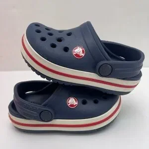 Navy blue slippers with red and white accents. Easy slip-on design. Durable and comfortable for kids.