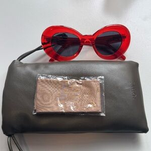LOEWE NWOT Eyewear's sunglasses have red bubble-like round frames as a fresh take on '60s styles. They're decorated with the gold-tone logo in cursive font at the temple and fitted with dark-gray lenses. Includes Loewe branded padded case and chamois cloth. NWOT