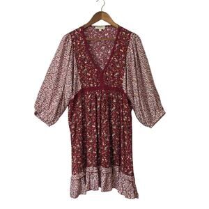 Umgee + Womens Sz 1X Burgundy Floral Tiered Lace Festival BOHO Babydoll Peasant Dress