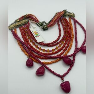 Vibrant multicolor beaded statement necklace. Features pink, orange, and red beads with dangling stones. Perfect for adding a pop of color. Some tarnish on the gold noted. Please see all pictures.