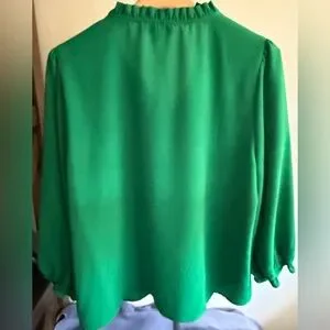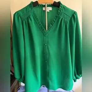 Chic emerald blouse with V-neckline. Features button front and ruched shoulders. Ideal for versatile styling.