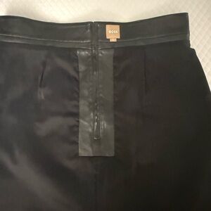 Elegant black leather skirt by Hugo Boss. A-line design for versatile styling. Length = 30” Fully lined. Like new. Very soft leather.